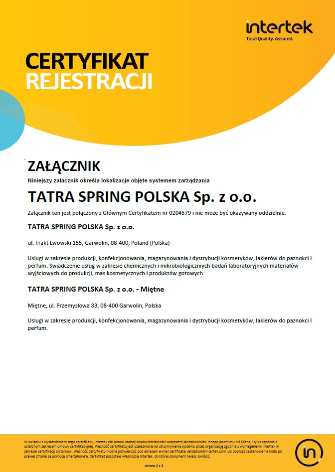 Certificate of ISO 22716:2007 for Tatra Spring Polska Sp. z o.o.